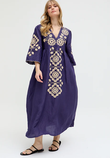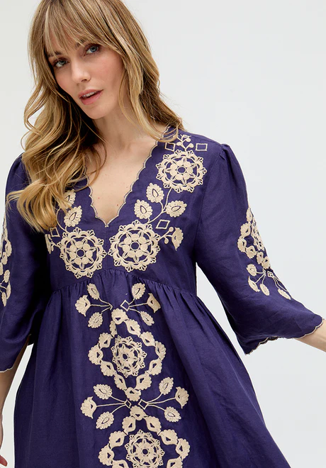 Inspired by embroidered dresses, this dress offers a stunning new interpretation. Crafted from a luxurious linen blend, this extra-long silhouette exudes a serene blue hue and effortless elegance. Featuring puffy short sleeves and a captivating deep V-neck, the Arianna dress is adorned with delicate floral embroidery in a soft ivory white, adding a touch of refined artistry. The dress gracefully falls above the knee and is finished with a delicate scalloped hem, perfectly embodying a relaxed yet sophisticated vacation style. Material and Care Machine wash separately in cold water with a mild detergent. Do not bleach. Do not tumble dry. Gentle ironing.